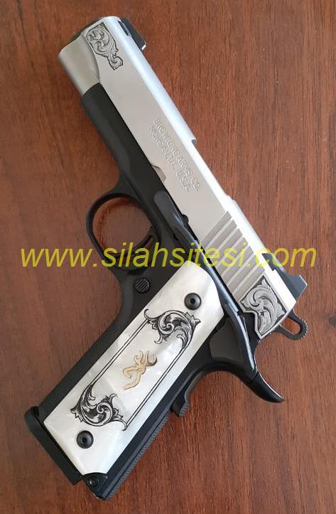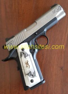 ÜST KAPAK PASLANMAZ ÇELİK, GÖVDE ALEMİNYUM KOMPOZİT İŞLEME, KAPAK TAKIMI ,GÖVDE VE KABZEDE AYNI GRAVÜR İŞLEME, İNCİ KABZE, İKİ TARAFLI MANDAL EMNİYETİ VE KABZE EMNŞİYETİ, TEK ELLE TAŞINABİLEN KİBAR TAŞIMAYA ÇOK UYGUN, TÜRKİYEDE ÇOK NADİR BULUNAN BİR TABANCA.
